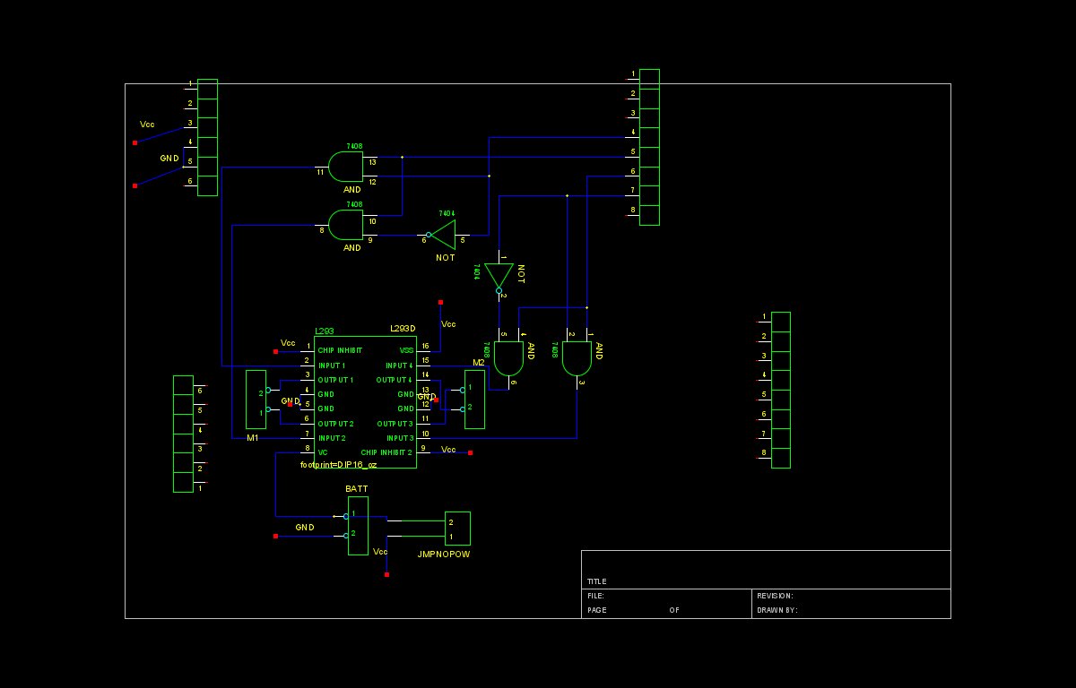 sur Gentoo, mais personnellement j'ai fini par agréger ma propre librairie de composants afin d'obtenir des descriptions cohérentes utilisables sur l'ensemble des logiciels de la suite gEDA, les composants fournis d'office n'étant généralement plus utilisables dès qu'on veux passer d'un logiciel de la suite à un autre. - Faite apparaitre vos connecteurs sur le schéma logique :) ! On n'y pense pas forcément lorsqu'on a le nez dans le schéma fonctionnel mais il est essentiel de se rappeler que votre "signal IN" devra bien venir de quelque part sur votre circuit imprimé physique. Vous devez donc absolument ajouter à votre schéma gschem les composants de connectique.