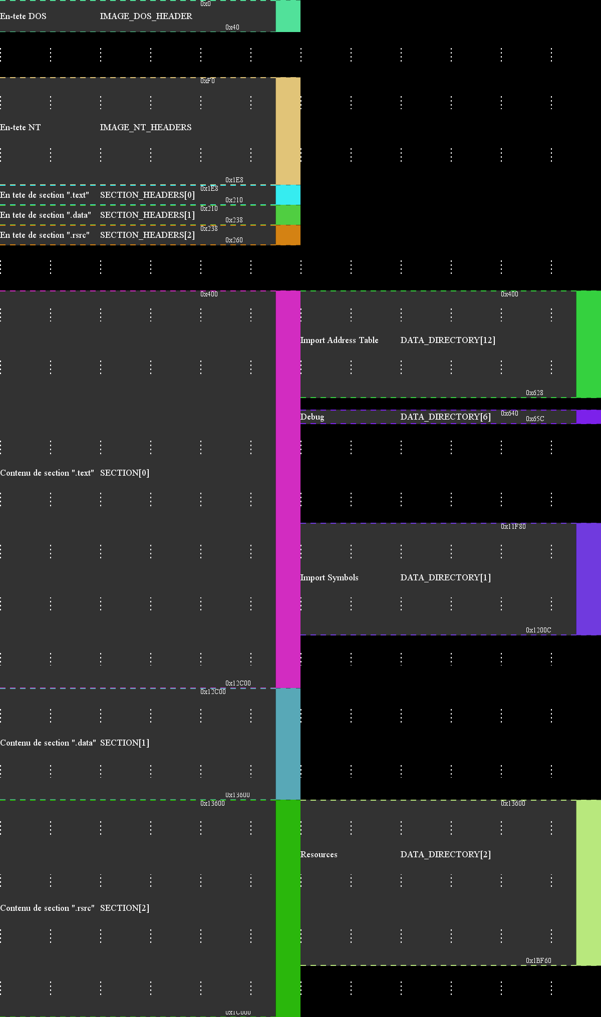 La première image est une représentation à l'échelle des différentes structures du fichier PE sur disque (pas tel qu'il sera mappé en mémoire donc). La seconde image n'est qu'une représentation "compressée" de l'image précédente où j'ai inséré des séries de "petits points" pour remplacer visuellement les énormes applats de couleurs unis représentant des zones de fichier où "rien de spécial ne se passe" et qui rendent le premier type d'image carrément gigantesque (1200x14688 pour représenter "calc.exe" dans mon environnement de test ;) ). Voilà comment on s'en sert :