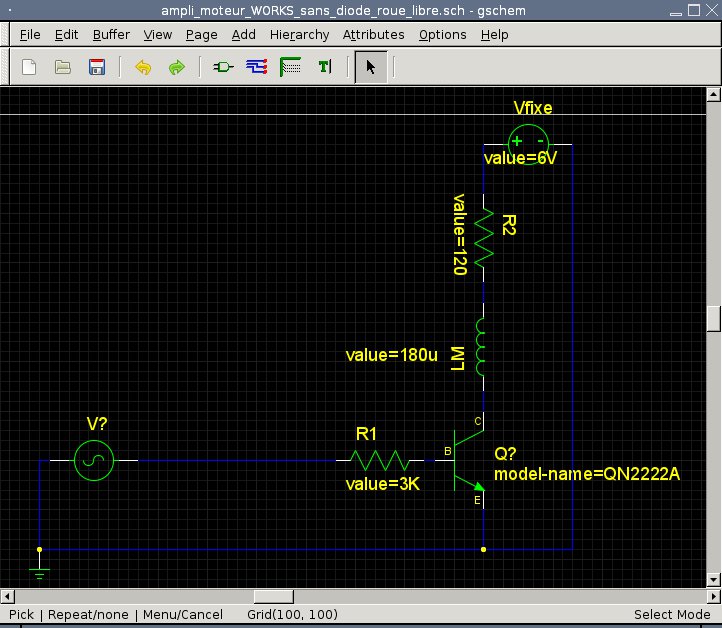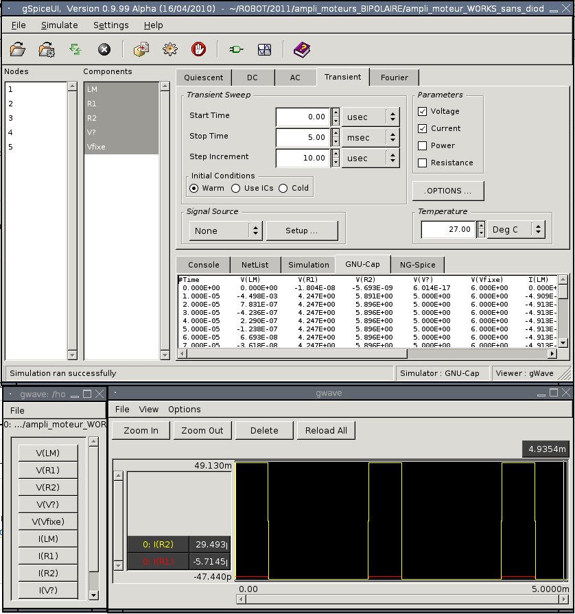 Il ne me reste plus qu'à conclure en vous disant qu'aussi bien oregano que gspiceui s'appuient en fait discrètement sur des moteurs de simulation électronique indépendants (le plus connu étant "SPICE", mais gnucap fonctionnant tout aussi bien si ce n'est mieux (c'est d'ailleurs ce dernier que j'utilise)) ; Que ces moteurs de simulation mangent des fichiers au format "netlist" qui sont générées par oregano ou gspiceui7 ; Que les deux derniers screenshots (gschem et gspiceui) correspondent justement à un schéma d'alimentation de puissance pour moteur que j'ai moi-même pensé ; Que cet amplificateur de puissance fonctionne ; Qu'il est super simple et tout pourri aussi bien en rendement qu'en fonctionnalités (il ne permet de faire tourner le moteur que dans un seul sens par exemple) ; Mais qu'il fonctionne (oui, j'en suis fier :-p !) ; Et enfin que je vous déconseille de l'utiliser en l'état car sur les screenshots il manque la diode de roue libre.
